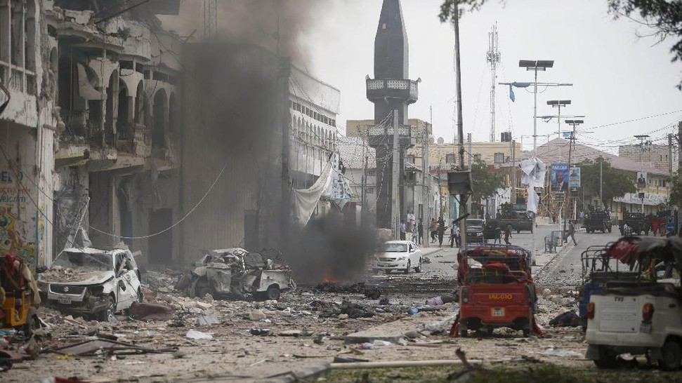 Sebuah mobil yang menabrak gerbang Hotel Dayyah, Mogadishu, Somalia meledak dan menghancurkan bangunan yang ada di sekitarnya. (Reuters/Feisal Omar)