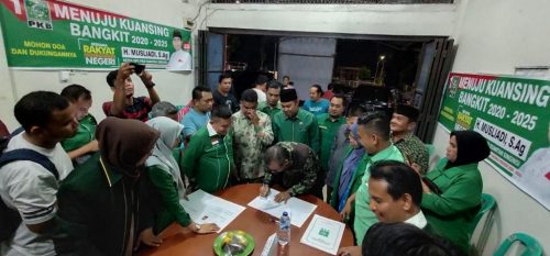 TELUKKUANTAN (KuansingKita) – Pendaftaran calon incumbent H.Mursini di Sekretariat PKB Sabtu (30/11/2019) malam tadi menyajikan cerita menarik. Betapa tidak, dalam proses pendaftaran itu, H.Mursini duduk bergandengan dengan Indra Putra alias Kota
