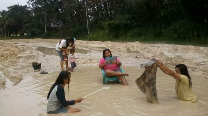 Gambar Utama : Jalan rusak belum dilakukan perbaikan, warga protes dengan mandi pada genangan air di badan jalan (foto KuansingKita)