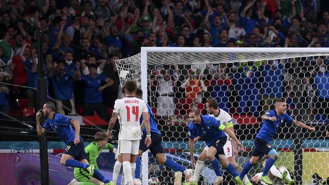 Bola liar yang membentur tiang gawang ini jatuh di dekat Leonardo Bonucci. Hanya dengan satu sontekan, Leonardo Bonucci berhasil menjaringkan bola ke gawang Inggeris tanpa bisa dihalau Pickford. Skor imbang 1-1