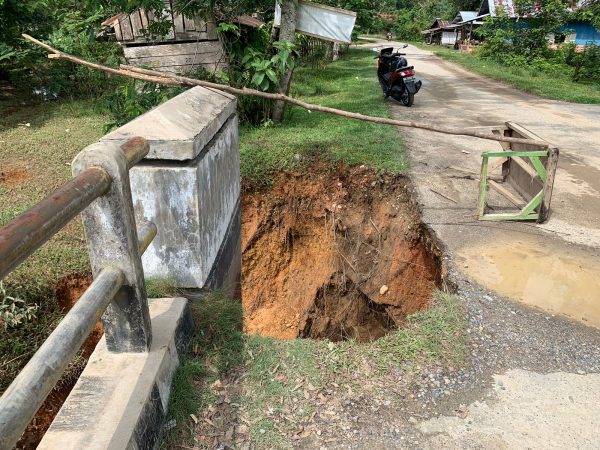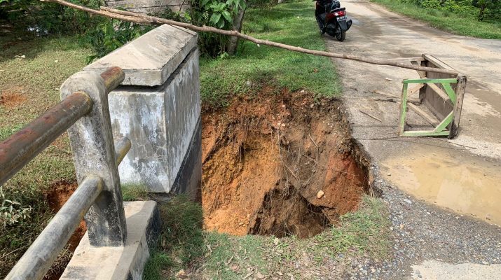 Pasalnya, tanah pondasi jembatan di kawasan Mesjid Koto Taluk itu mengalami longsor yang cukup serius. Ceruk lobang sedalam 2,5 meter membuat pondasi jembatan berpotensi bergeser sehingga dikhawatirkan jembatan ambruk