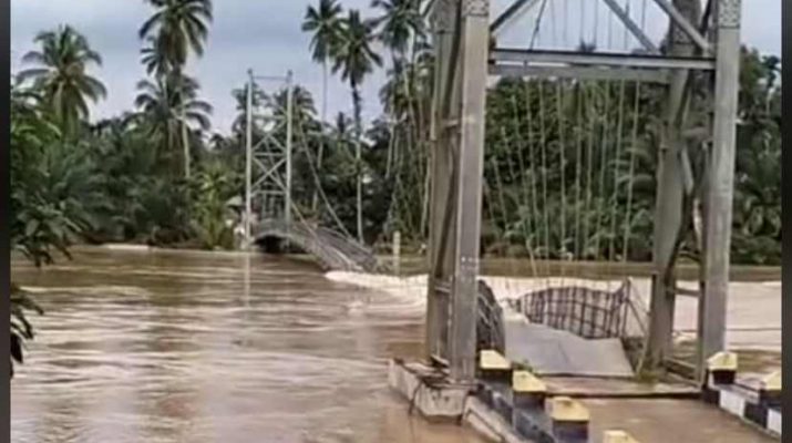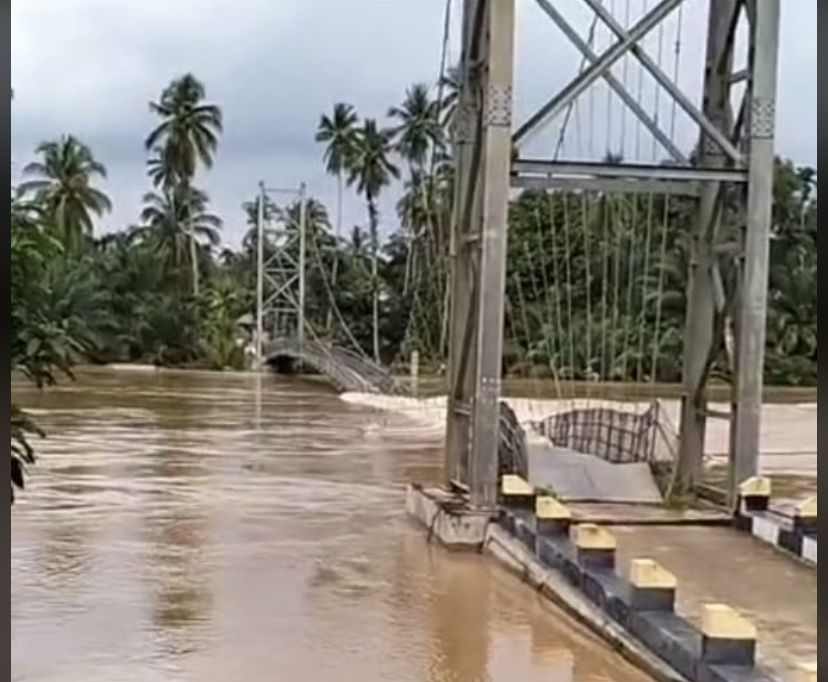 Pasalnya, sejak Rabu (3/1/2024) siang sekitar pukul 12.30 WIB, jembatan gantung ini terseret arus deras setelah luapan air sungai Kuantan di kawasan itu menjangkau lantai jembatan. Ini disebabkan wilayah Kuansing saat ini memang tengah dilanda banjir