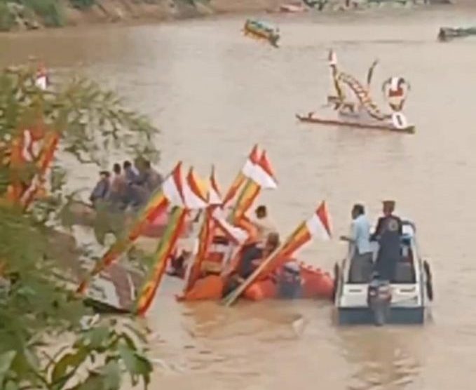 TELUKKUANTAN(KuansingKita) – Sampan hias atau berondo yang dinaiki Bupati Kuantan Singingi Suhardiman Amby dan Ny Hj Yulia Herma beserta rombongan karam di kawasan pancang start gelanggang pacu jalur Tepian Rajo Pangean, Jumat (4/7/2025) sekitar pukul 14.10 WIB